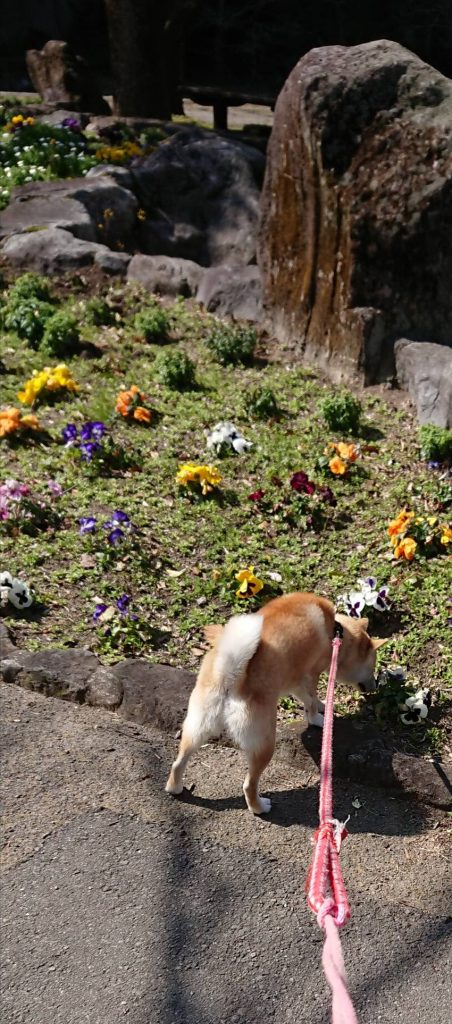 公園の花壇 パンジー の臭いに興味あるのかなー と 思ったら